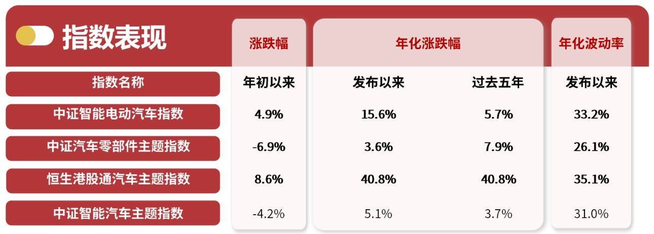 中证智能汽车主题指数:年初以来下跌 4.2%,发布以来年化涨幅 5.1%,过去五年年化涨幅 3.7%,发布以来年化波动率 31.0%。指数覆盖 “智能汽车软硬件及解决方案” 环节,选取智能汽车硬件软件提供商、整车厂商、互联网厂商等,TOP5 成份股比亚迪、立讯精密、赛力斯、长安汽车、拓普集团合计占比 26.7%;行业分布上,汽车零部件占比 23.0%、半导体占比 19.3%、乘用车占比 16.0%,TOP3 行业合计占比 58.4%,聚焦智能汽车软硬件赛道。