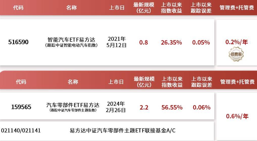盘点易方达基金旗下汽车产业系列 ETF ,详见下图所示: