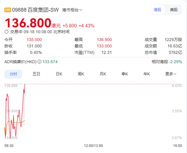 而今日(9月18日)开盘,百度股价亦表现不俗,截止发稿前,在港股表现一度超过了136港元/股。