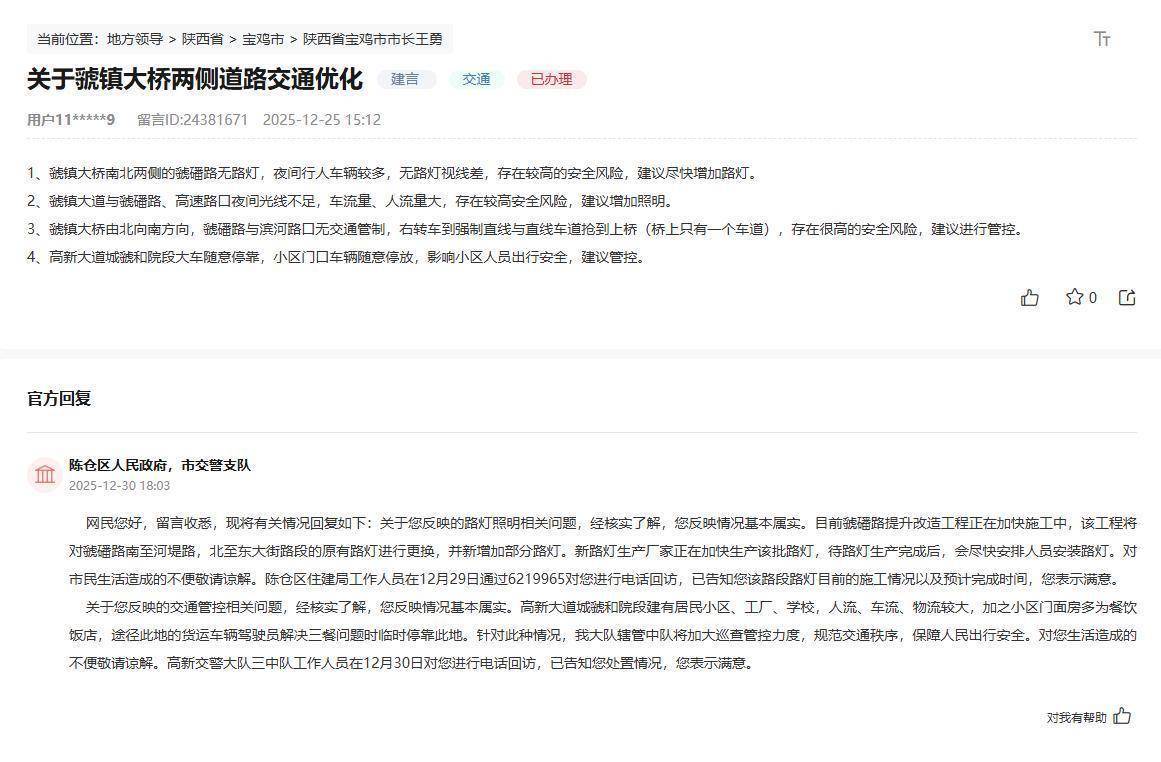 从路上无路灯到车辆随意停放,从地铁导向标识安装不当到交通指示牌缺失,近日,有陕西网友通过人民网“领导留言板”留言,反映出行时遇到的不便。对此,陕西相关部门高度重视,积极回应群众诉求,持续优化城市交通治理体系。