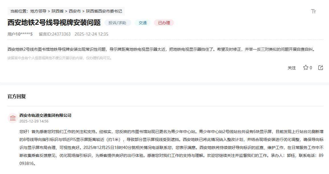 对此,西安市轨道交通集团有限公司回复称,市图书馆站现已更名为青少年中心站。青少年中心站2号线站台共设有6块显示屏,目前发现上行站台北侧新增的8号线导向指引标识与邻近PIS显示屏距离较近(约1米),导致部分显示屏视线受到遮挡。